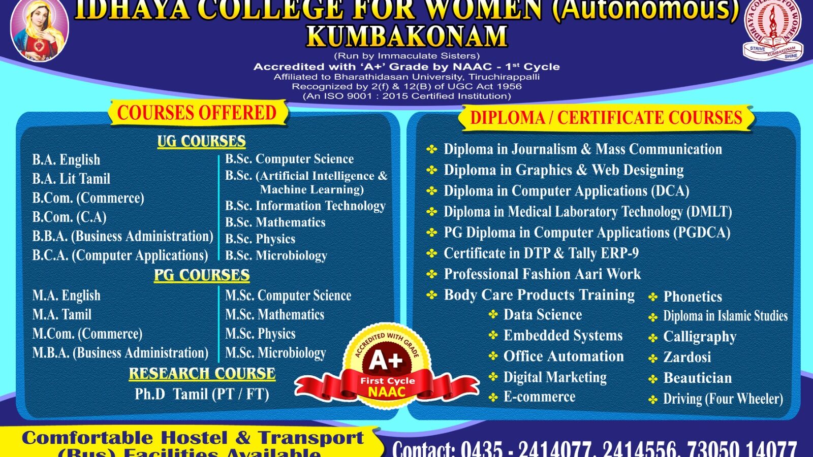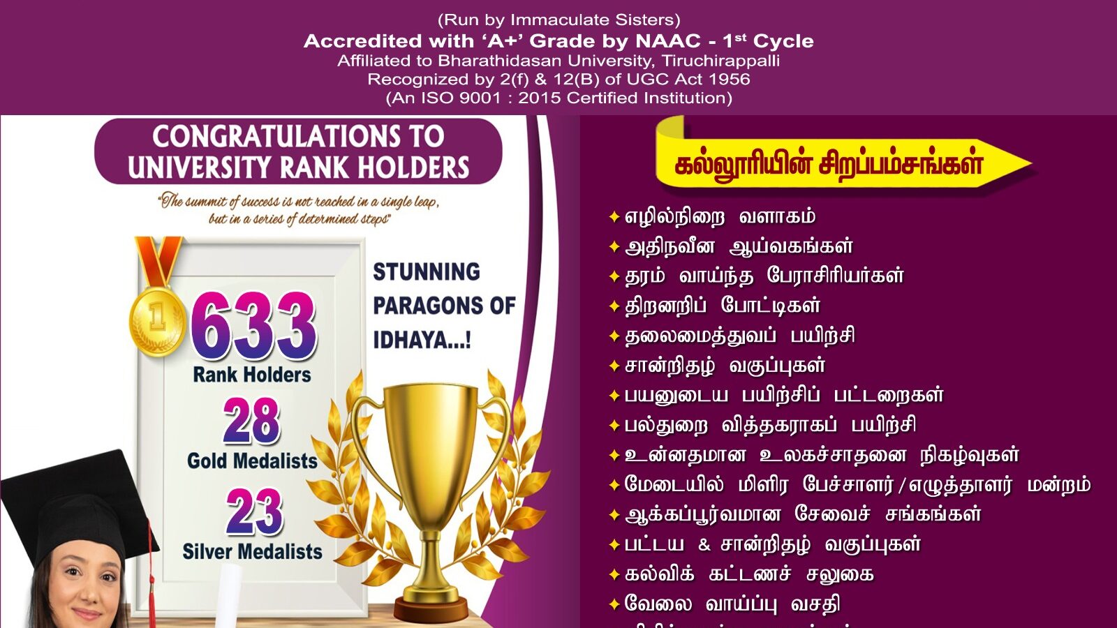 Idhaya College for Women was founded by the Franciscan Sisters of the Immaculate Heart of Mary, Puducherry in the Jubilee year 2000. It is established to fulfill the vision of the 24th General chapter moulding self – reliant women of our predilection by providing higher education irrespective of caste and creed. The congregation was started in Puducherry in the year 1844. It realizes the absolute need for women’s education. It firmly believes that growth in women’s education would be instrumental in fostering and raising the quality of family life.